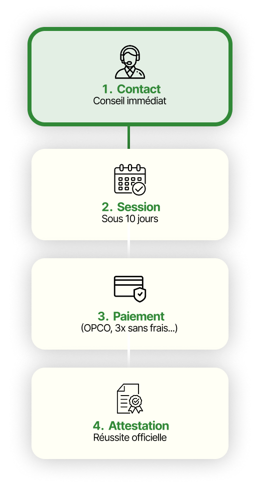 Une formation 100% pratique et conforme au nouvel arrêté du 17 mars 2025. Cas réels, exercices concrets, et examens blancs inclus pour garantir votre réussite.